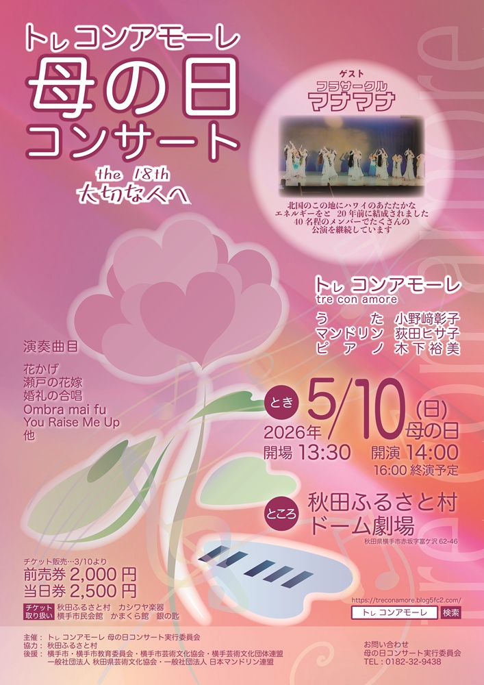 | 備考 | うた 小野ア彰子さん、マンドリン 荻田ヒサ子さん、ピアノ 木下裕美さん。 ゲスト:フラサークル「マナマナ」 お問い合わせはTEL:0182-32-9438(母の日コンサート実行委員会)。 |